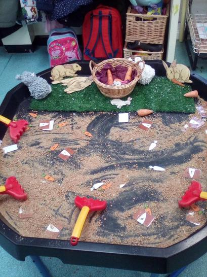 In the tuff tray we have been making people using Mr. Potato head, some wore hats, others had big smiles and some even wore shoes with a heel.