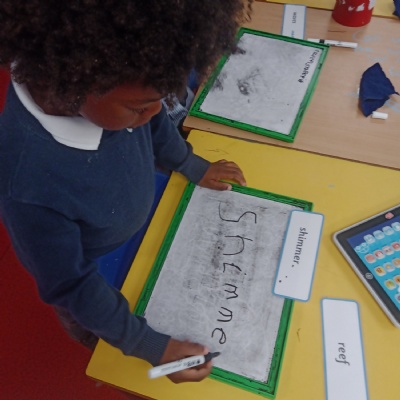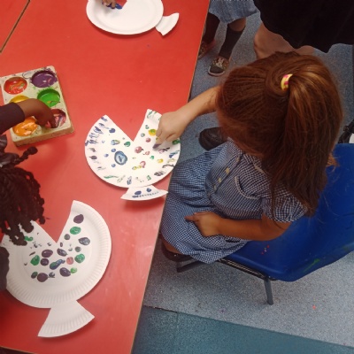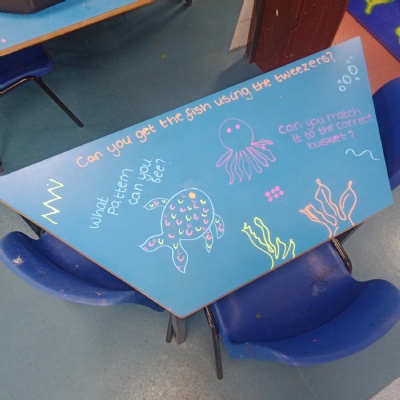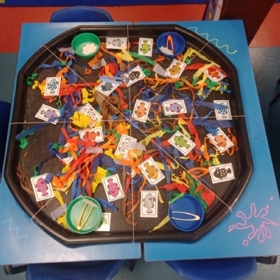 This term our topic is 'Fun at the Seaside'. The book we have been reading this week is 'Rainbow Fish'. During carpet time we discussed what makes a good friend, showing kindness and sharing. The children have made their own rainbow fish by drawing around their hand to create the fish, then using different coloured materials to decorate them. They practised their fine motor skills, using tweezers to pick up the fish. They then recognised the pattern on the fish and matched it to the correct pattern on the plates. The children have practised writing their sounds and copying some of the words from the book. They have also enjoyed using celery and paint to create the scales on their fish.