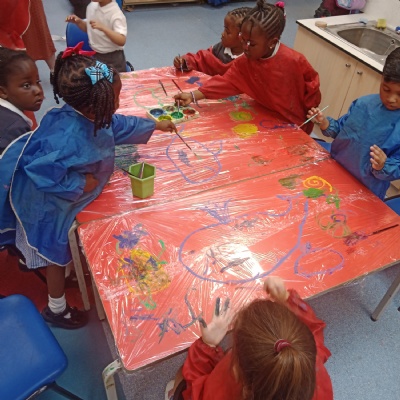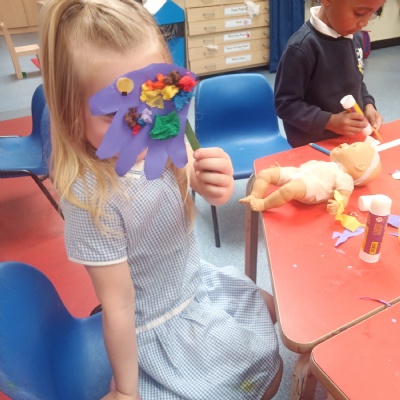 This week the children have continued to explore the book 'Goldilocks and the Three Bears'. They have enjoyed mixing paints to make brown and using paper plates to make their bear masks. They have matched the three bears and their objects and talked about what makes goldilocks happy and sad. The children have continued to explore and recognise colours, shapes and numbers.