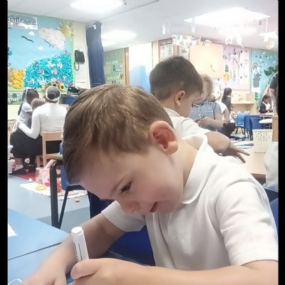 This term our topic is 'Once Upon A Time'. Our book for this week is 'The Three Little Pigs'. The children have enjoyed lots of fun activities such as building the pigs houses from different materials, talking about what they can see, what textures they can feel and predicting which house will stay standing. The children have been using their fine motor skills making colourful tails for the pigs by threading beads onto pipe cleaners, counting how many beads they have used and also using repeating patterns. On our literacy table the children have been practising their letter formation by copying the letters wrote on the table.