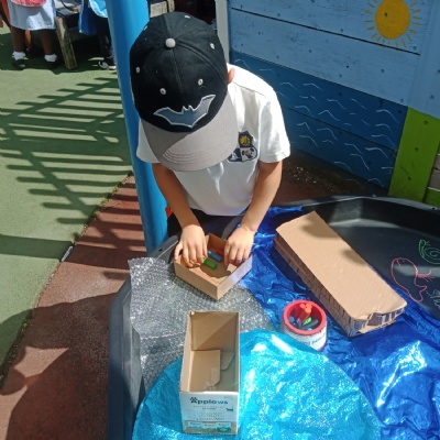 This week in Nursery the children have started a new book 'The Snail and the Whale'.  We have been discussing ways to travel, where we would like to go on holiday, what we would do when we are there and who we would like to take. They have designed and made boats for the snail's journey. They have followed the snail around on his journey recognising numbers and filling in the next number, as well as colour by number. The children have enjoyed using paints on cling film and painting different animals from the book. During carpet time we used the interactive board for counting sea creatures and recognising the correct number.