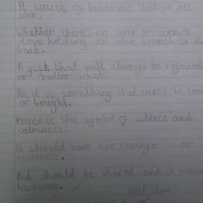 To culminate our learning, we created some 'Peace Poetry' which explored what peace means to us.