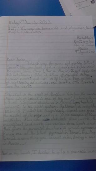 This week the class have been writing letters as if they have visited Mexico and at least two attractions – one that is humanistic and one physical to show their understanding of the differences between them.